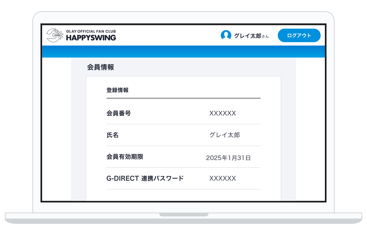 ログインすると『会員情報』ページに移動し、ご自身の「会員番号(HAPPY SWING No.)」「氏名」「会員有効期限」などが表示されます。