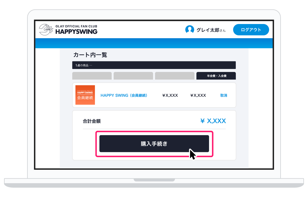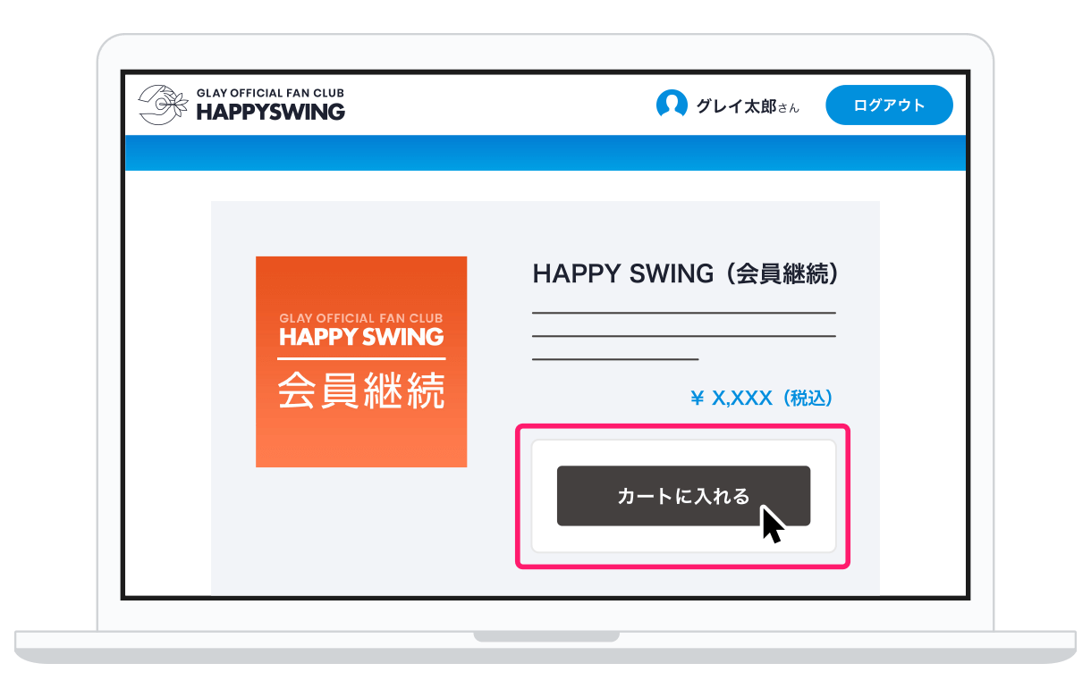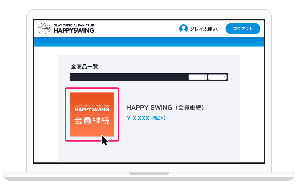 商品一覧ページより、『HAPPY SWING会員継続』を選択して下さい。