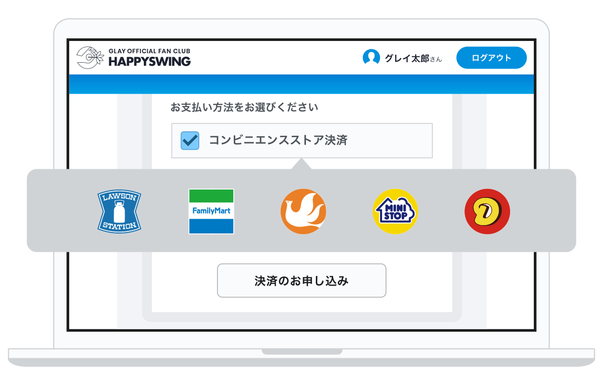コンビニエンスストアでのお支払いは、ローソン/ファミリーマート/セイコーマート/ミニストップ/デイリーヤマザキ・ヤマザキデイリーストアのいずれかの店舗がご利用頂けます。