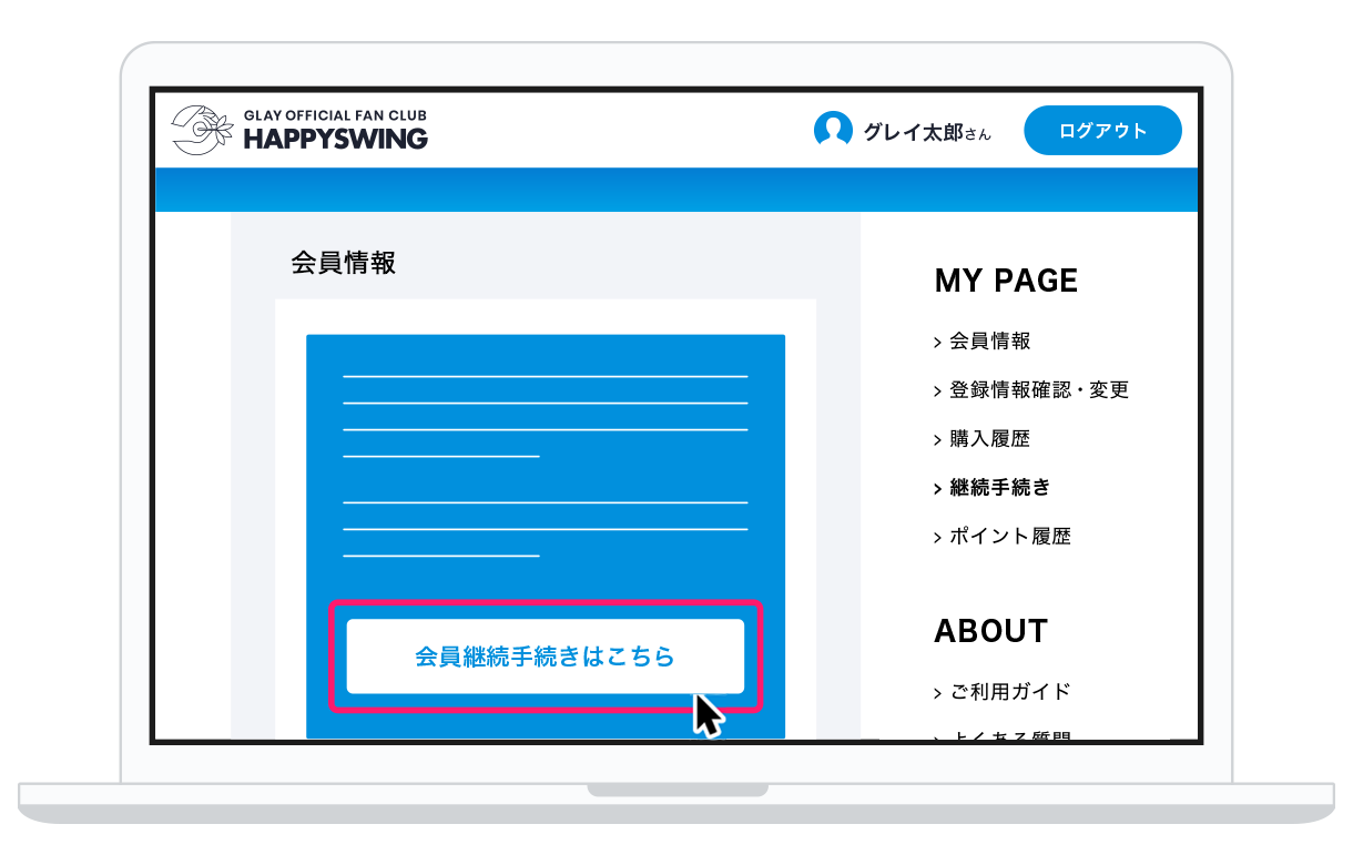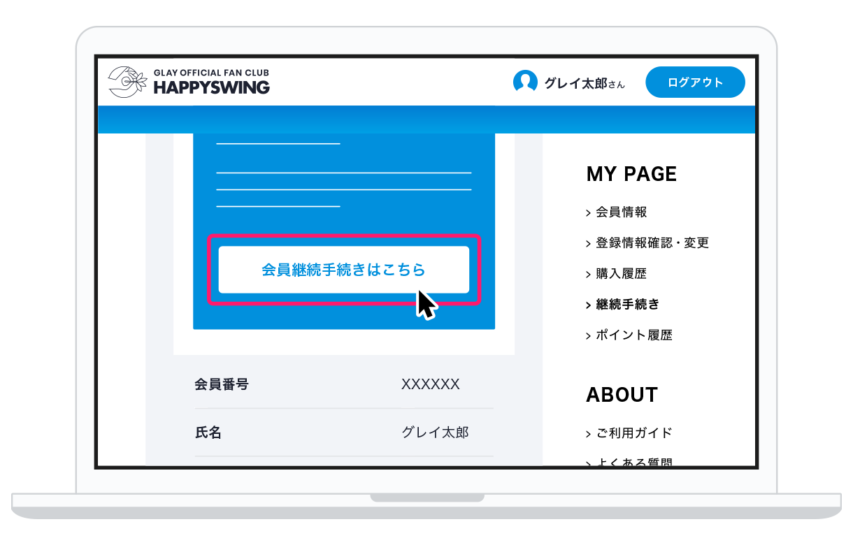 以下の手順に沿って、期間中にHAPPY SWING「MY PAGE」(HAPPY SWING会員専用「MY PAGE」)内『会員情報』ページに表示される『会員継続手続きはこちら』ボタンからお手続きをお願い致します。